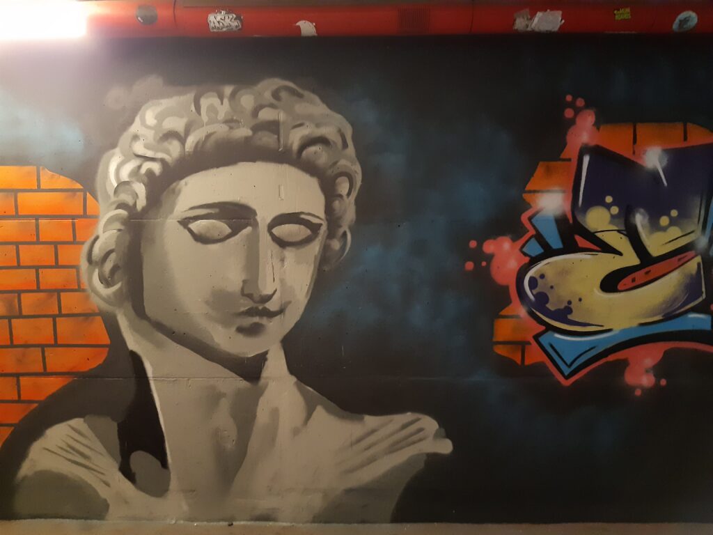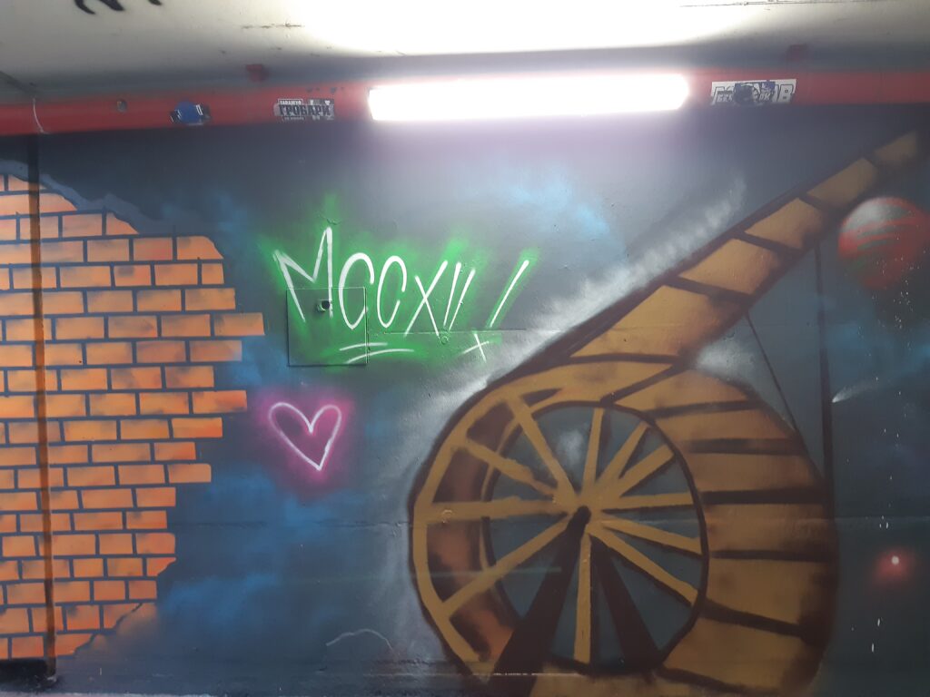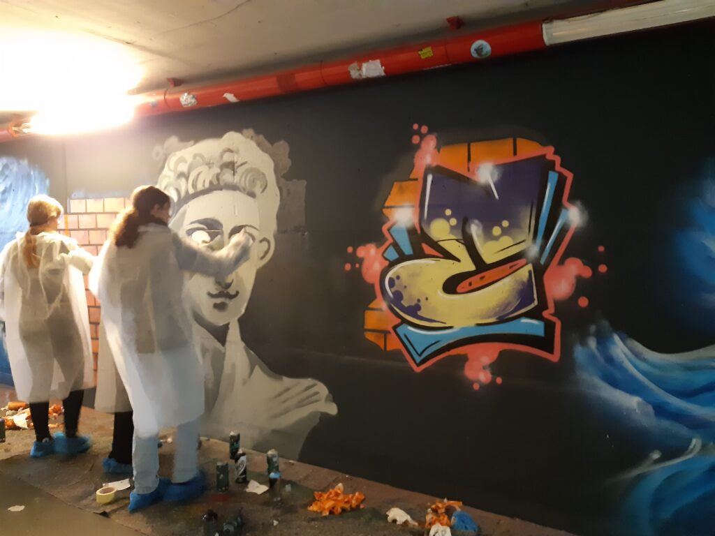 Mit zwei weiteren Schulen aus Enns und dem JUZ nahm unsere Schule bzw. 13 Schüler*innen der 6A und unsere Zeichenlehrerin Frau Prof. Eichler an einem spannenden Graffiti-Projekt der Gemeinde Enns in Kooperation mit der Agentur CanLab Art Projects teil. Ziel war, auf einer zur Verfügung stehenden Fläche in der Bahnhofunterführung Enns einen Beitrag zu gestalten, der die Schule mit der Geschichte der Stadt Enns verbindet.