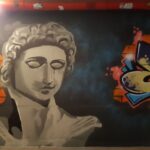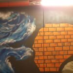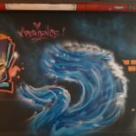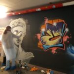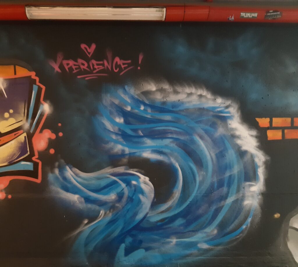 Am 13. Oktober vormittags ging es dann richtig los: Auf einer von der Stadt Enns vorbereiteten anthrazitfarbenen Wand durften wir unsere Ideen auf die Wände bringen. Nach einer kurzen Erklärung von Spray-Arten und Übungen, wurden wir in vier Gruppen aufgeteilt: Eine Gruppe gestaltete Ziegelwandmuster, die aus der Wand herausragen sollten. Die zweite Gruppe entwarf einen antiken Lastzug und etwas zum Thema Ennshafen. Die dritte Gruppe sprühte hohe Wellen an die Wand, die ebenfalls zum Hafen und zum Fluss Enns passen sollten. Die letzte Gruppe wagte sich an die Darstellung einer römischen Skulptur. Außerdem bekam jede Teilnehmergruppe einen Buchstaben von „Enns“ – wir erhielten den Buchstaben E und wählten dafür das Wort „Experience“, stellvertretend für all die Erfahrungen, die wir in Enns sammeln dürfen. Auch unser Schullogo wurde von unserem Leiter Daniel an die Wand gesprüht und wir alle durften noch unterschreiben.