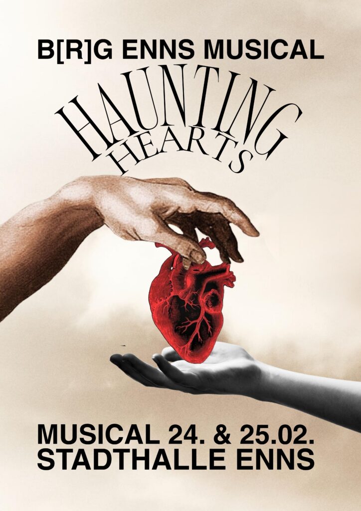 Wir, das Musical-Team des b[r]g Enns, bringen im Februar 2026 das Musical „Haunting Hearts – Liebe zwischen den Welten“ auf die Bühne. Wir laden Sie herzlich dazu ein, die Abendvorstellungen am 24. und 25. Februar zu besuchen. Tickets können jederzeit bei Mitgliedern des Musical-Teams erworben werden.