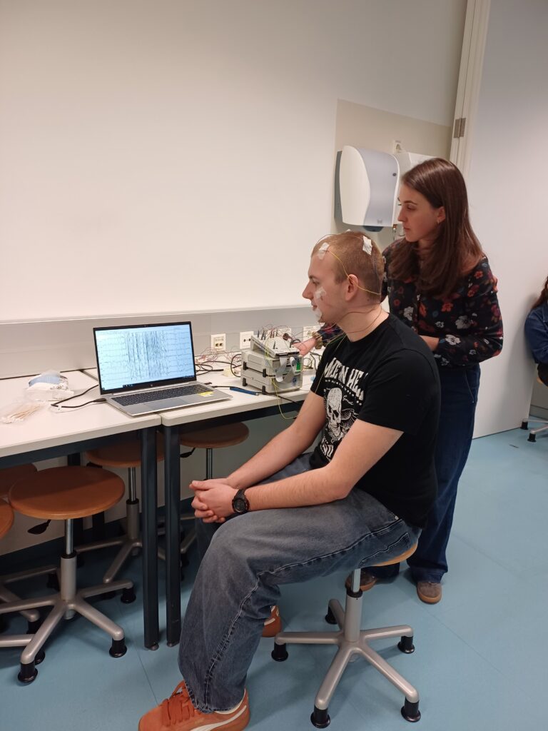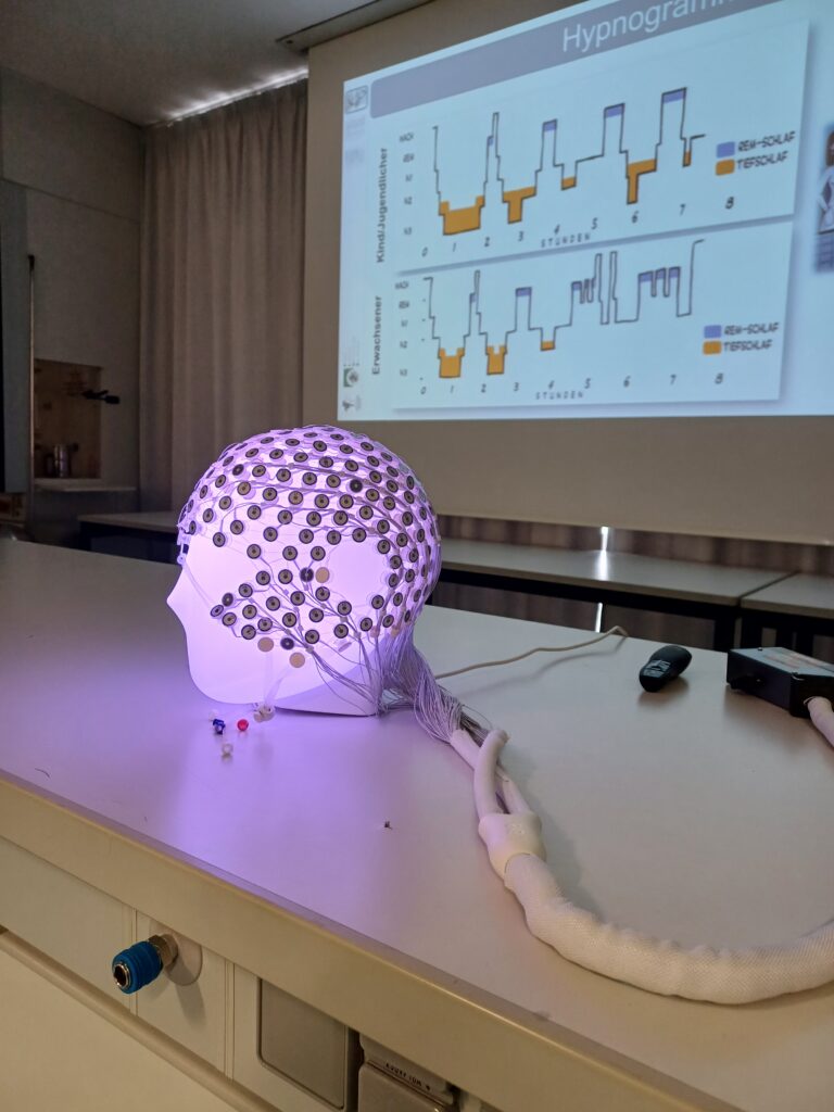 Im letzten Workshop ging es um Gehirnstrommessungen wie sie z.B. in einem Schlaflabor überprüft werden. Wie können mit diesen Gehirnströmen Schlafprobleme erkannt werden? Welche Parameter werden in einem Schlaflabor noch überprüft? Wie werden Elektroden am Kopf angebracht, die diese Gehirnströme messen und warum? Diesen und noch mehr Fragen wurde versucht im letzten Teil dieses Vormittages nachzugehen.