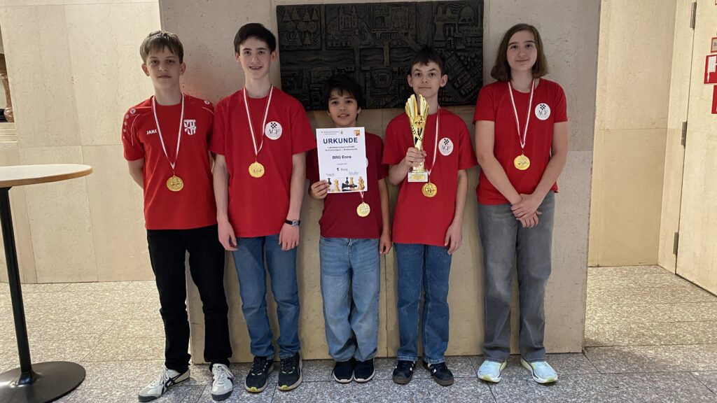 Jedes Team setzte sich dabei aus vier Spieler*innen und einem möglichen Ersatzspieler zusammen. In sieben Runden Schweizer System mit je 20 Minuten Bedenkzeit sollte schließlich der Landesmeister der 52 Mannschaften ermittelt werden. Unsere Schule wurde dabei von Noah Pleimer (3AG), Thomas Kim (4DR), Tony Pollak (1D), Stella Haslinger (4DR) und David Hoffelner (4DR) vertreten.