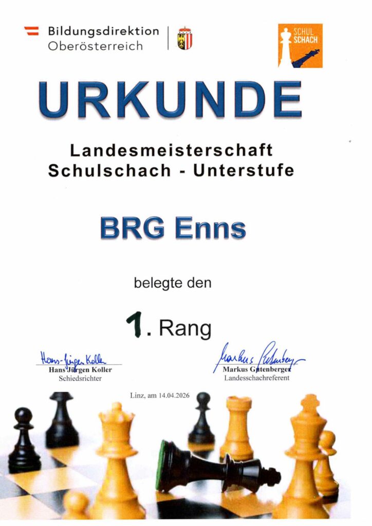 Am 14. April 2026 fand im Neuen Rathaus in Linz die oberösterreichische Schulschach-Landesmeisterschaft in der Sekundarstufe 1 statt, zu der sich über die vorangegangenen Bezirksmeisterschaften 52 Teams aus ganz Oberösterreich qualifiziert hatten.