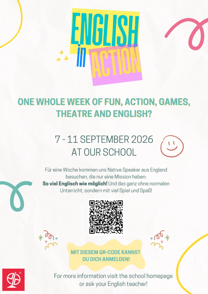 Alle Jahre wieder kommen uns am b[r]g Enns die Native Speaker aus England von English in Action besuchen. In der letzten Sommerferienwoche (07.09.-11.09.2026, jeweils 8:00-13:35 Uhr) haben Schüler*innen die Chance, in diesen Kursen ihr Englisch in Szene zu setzen, den alltäglichen Gebrauch der Sprache auf spielerische Art und Weise zu verbessern und für das neue Schuljahr aufzuwärmen. Dabei gibt es keinen Unterricht im klassischen Sinn, sondern ganz viel Spiel und Spaß.